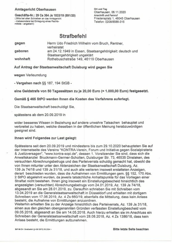 Nun zum eigentlichen, hier behandelten Vorgang: Der nachstehende Strafbefehl (Nr. 2) bezieht sich dezidiert auf die Meinungsäusserung im Award von UvB, was Partei-Verrat und versuchter Abrechnungsbetrug ist.