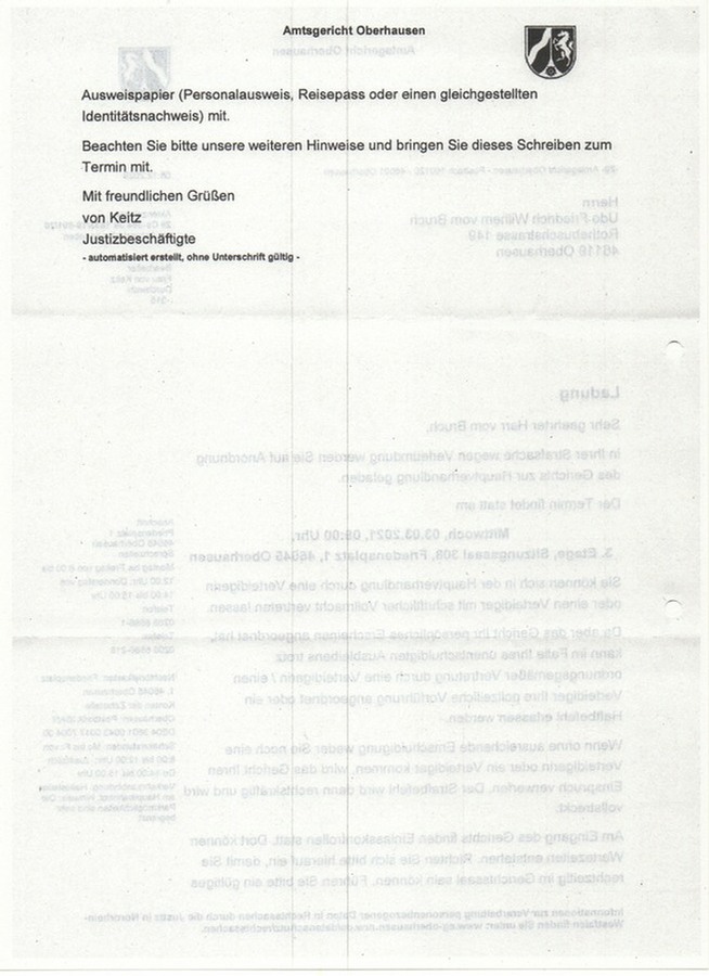 Gegen diesen Strafbefehl hat UvB Widerspruch bzw. Beschwerde eingelegt, das sparen wir uns hier. Daraufhin kam die Ladung zum Termin -